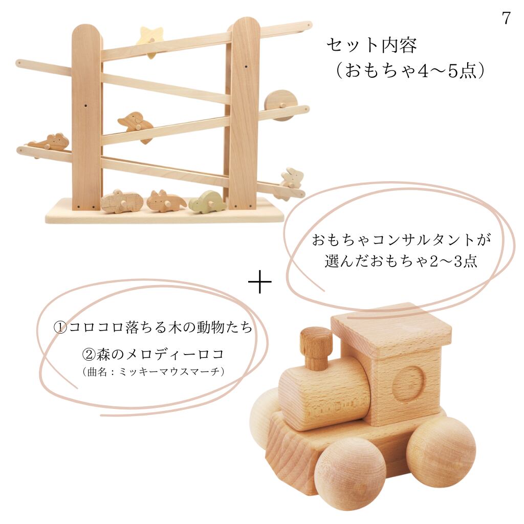 お選びいただいた2~3点のセットに、おもちゃコンサルタントが選んだおもちゃ2~3点を加えてお送りいたします。